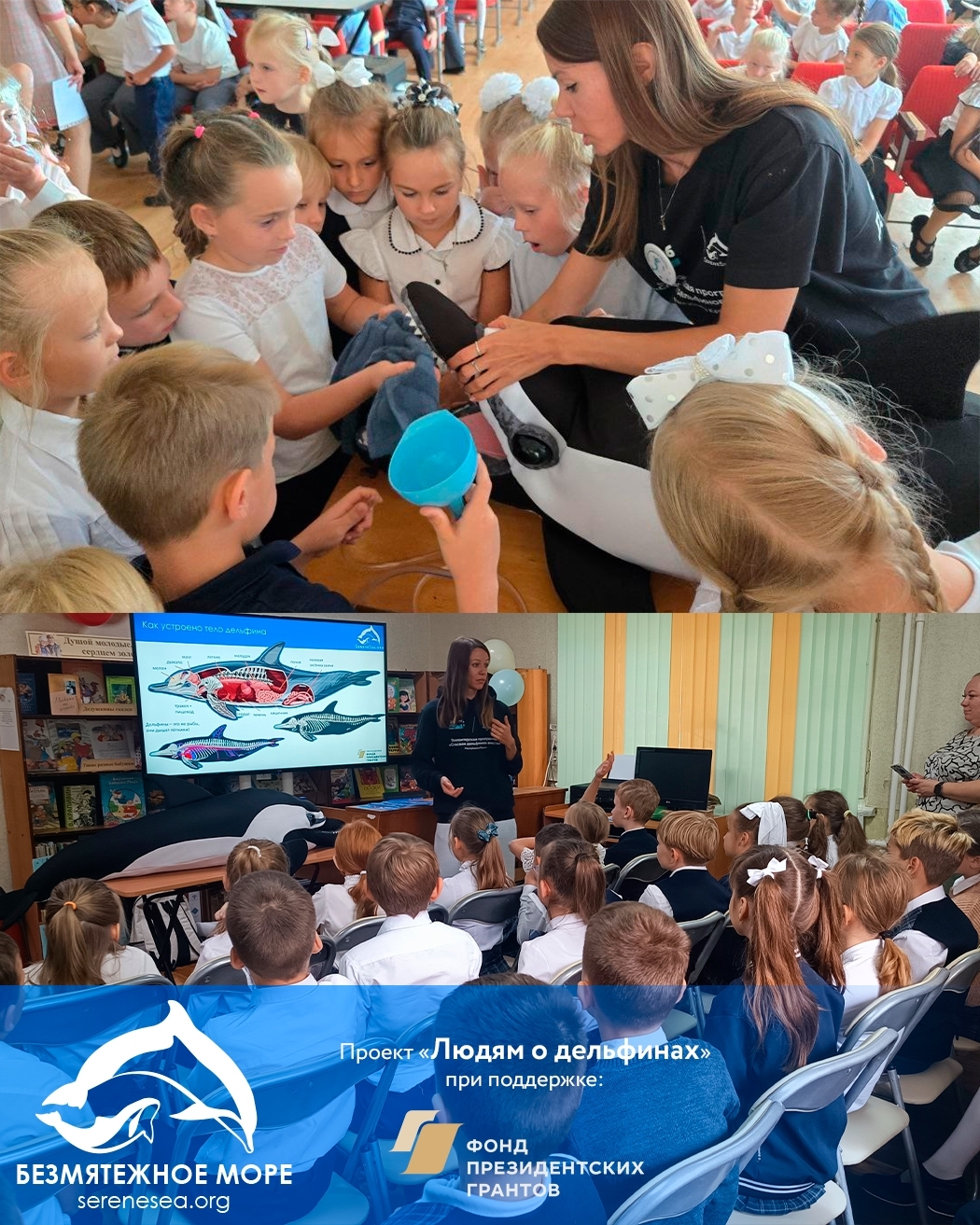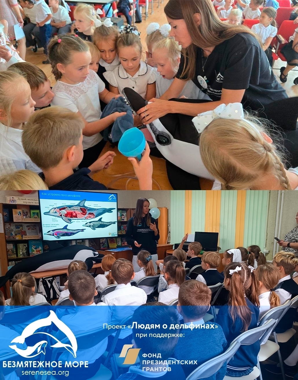 Этот год однозначно можно назвать самым образовательным годом «Безмятежного Моря» — благодаря поддержке Фонда президентских грантов мы провели уже более 50 экоуроков и тренингов по оказанию первой помощи дельфинам, на которых побывали свыше 2 тысяч человек. На мероприятиях рассказывается о происхождении, биологии и проблемах сохранения черноморских китообразных, об их роли в экосистеме и о том, что можно изменить, чтобы улучшить их положение. И, конечно же, говорим об объективных причинах выбросов живых дельфинов на нашем побережье, о недопустимости выталкивания их в море, о наиболее частых патологических находках и о том, как реагировать на такую ситуацию правильно.