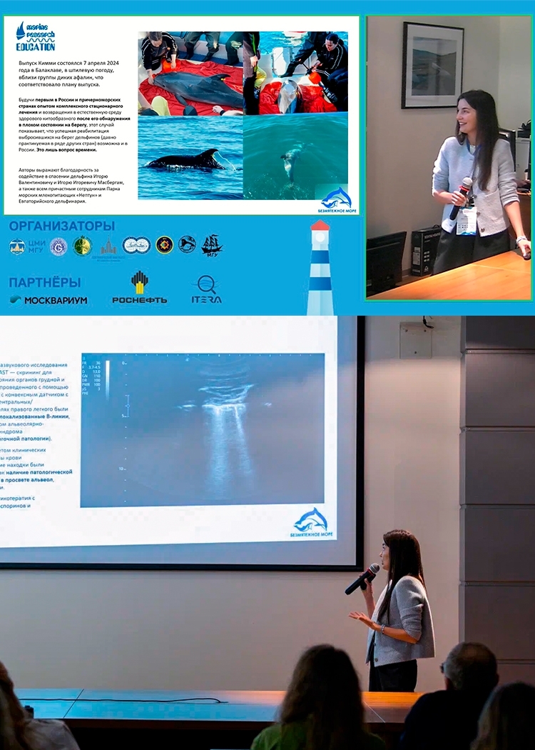 «Ультразвуковая диагностика легочных патологий у выбросившихся на берег черноморских китообразных». В постерном докладе рассмотрели эффективность использования УЗИ в ходе оказания ветеринарной помощи дельфинам, выбросившимся на берег, в условиях ограниченных ресурсов.