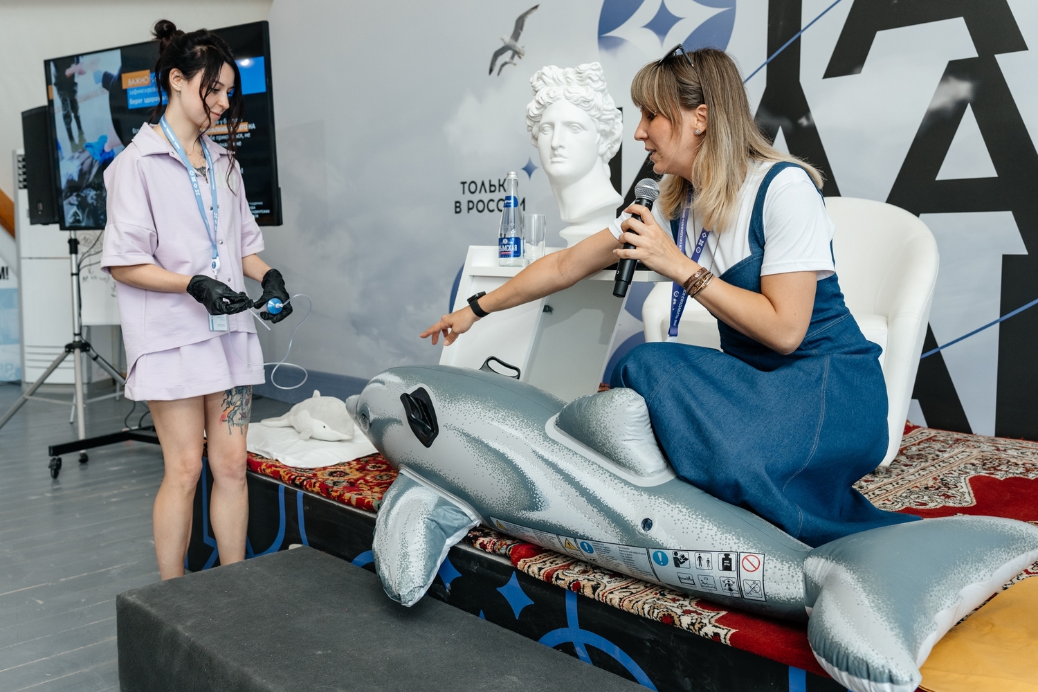 В новом павильоне РНКБ Банка посетители могли увидеть огромную статую дельфина из переработанных отходов, посмотреть видео с черноморскими китообразными из наших архивов, поучаствовать в конкурсе художественных работ «Жизнь дельфинов», а также послушать лекции об особенностях биологии и проблемах сохранения морских млекопитающих и стать участниками мастер-классов по оказанию им первой помощи при выбросах на берег, которые были проведены нашими участницами Еленой Коноваловой и Анной Русецкой.
