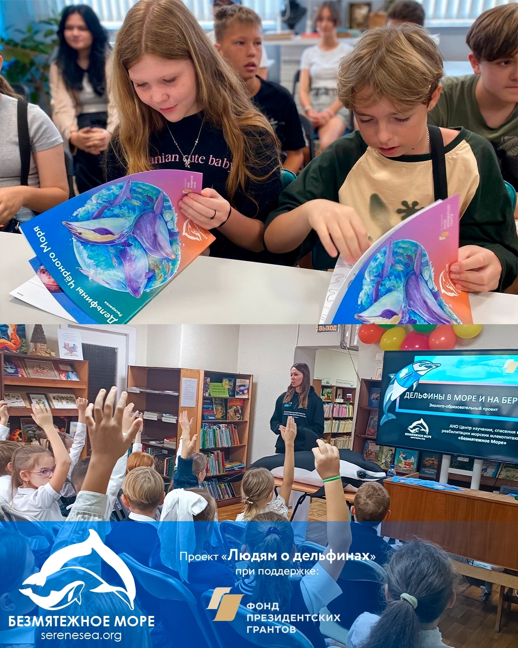 Наши же юные слушатели оказались очень заинтересованными и на удивление много знающими! А помимо диалога с ребятами о дельфинах, работах по их исследованиям и спасению, а также всех разбираемых вопросов, отдельный фурор вызвал наш штатный сотрудник — белобочка Сева, который помог ребятам применить на практике полученные знания по оказанию первой помощи дельфину на берегу. Также по случаю этой даты наша сотрудница Елена Коновалова побывала в гостях у «ГТРК Севастополь» с рассказом о китообразных и проблемах, с которыми они сталкиваются в нашем меняющемся море. Благодарим Фонд президентских грантов за поддержку, сотрудников библиотеки — за приглашение и уютную атмосферу! И напоминаем: если вы хотите пригласить нас провести мероприятие в вашем учреждении или на вашей площадке, обращайтесь на почту: e.konovalova@serenesea.org. Лекции, экоуроки и тренинги по оказанию помощи китообразным мы проводим бесплатно.
