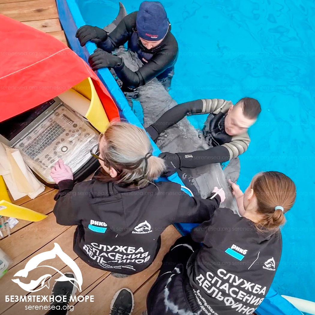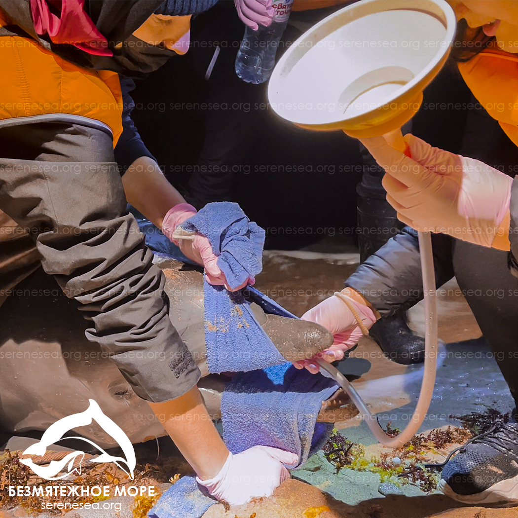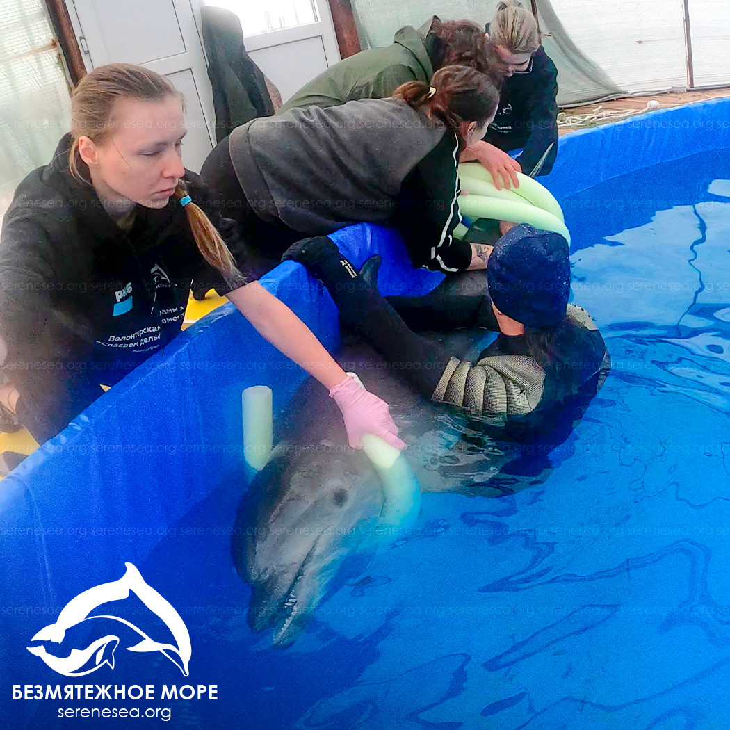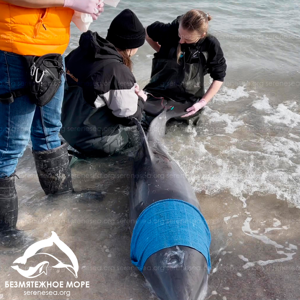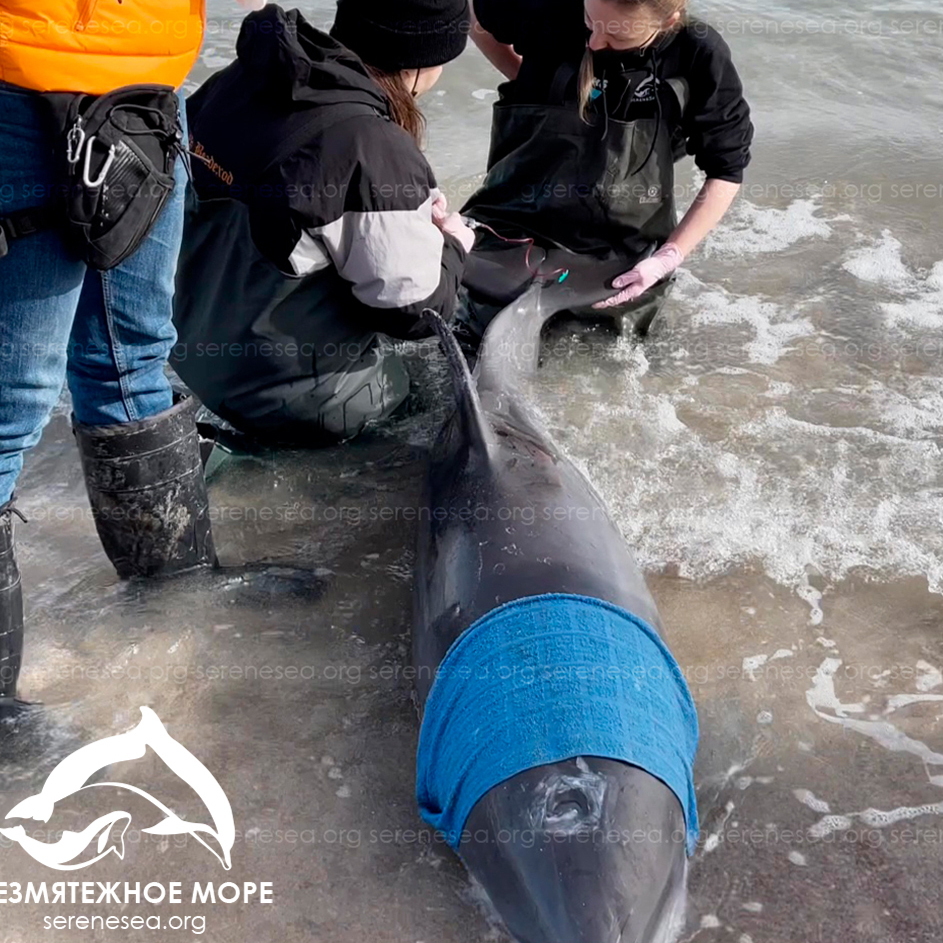 Путь нашей команды из Севастополя в Заозёрное составил 140 километров. По прибытию на месте уже находилось большое количество людей, и каждый, несмотря на холод и разгоняющийся шторм, старался помочь животному продержаться до момента оказания ветеринарной помощи. На месте наша команда провела первичную диагностику с помощью экспресс-анализов крови, в результате которой были выявлены средняя степень обезвоживания, электролитные нарушения и признаки воспалительного процесса. Подобные нарушения мы встречаем у выбросившихся китообразных на постоянной основе, так как на берегу оказываются исключительно тяжело больные или испытывающие значительное недомогание животные. Поскольку дельфины не пьют, а получают необходимую для организма пресную воду из съедаемой ими рыбы, в случае недомогания животное прекращает не только есть, но и потреблять жидкость, что стремительно приводит к ослаблению компенсаторных механизмов, усугублению заболевания и каскадному ухудшению состояния.